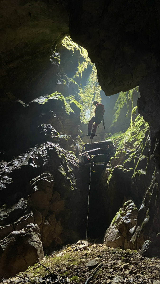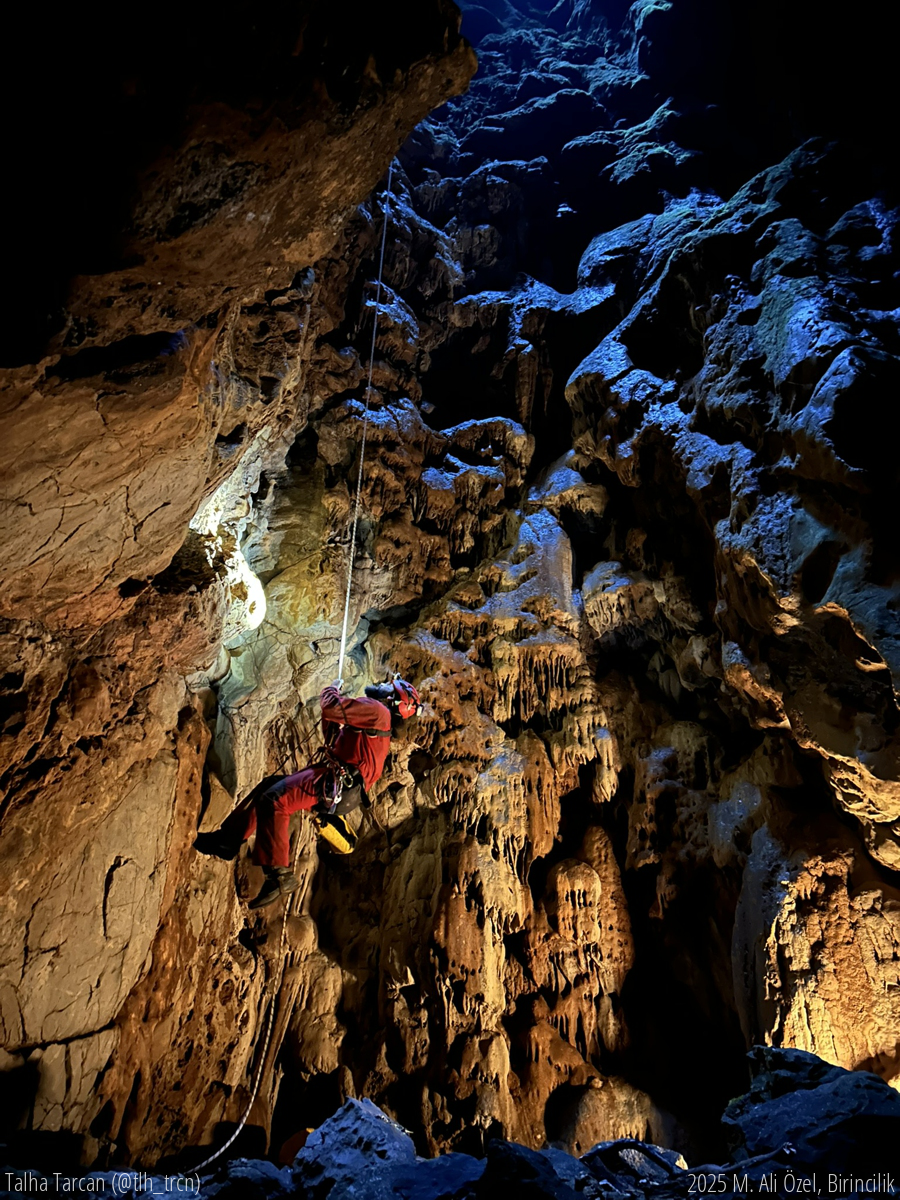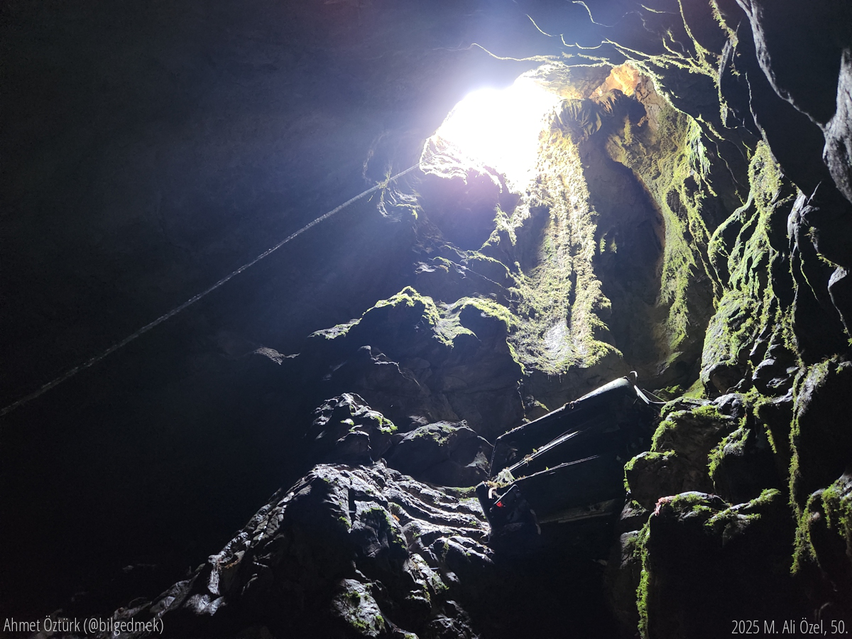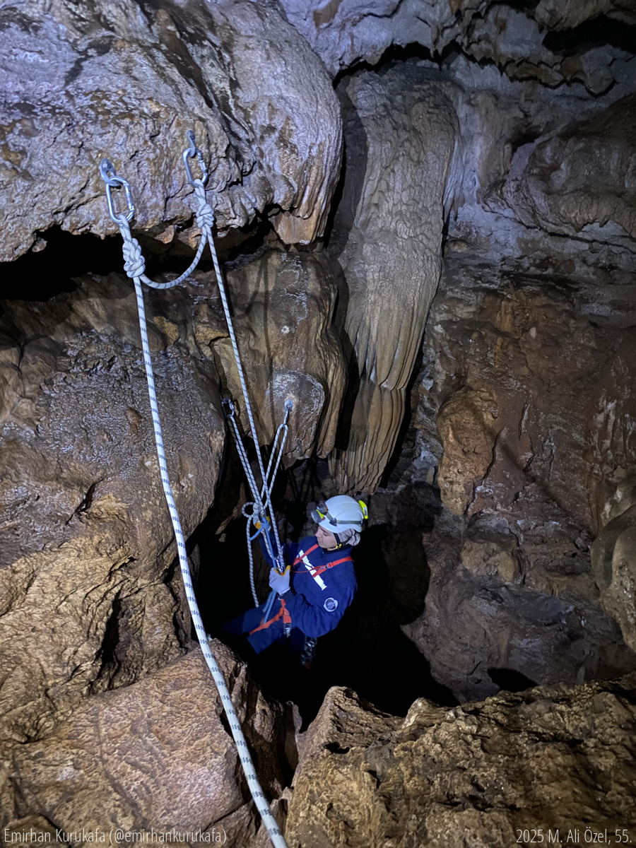 “İZMAD’ın ilk Kurcuk Düdeni faaliyetinde, ipten süzülerek mağaraya indik. Aşağı vardığımızda karşımızda öyle bir manzara vardı ki, sanki National Geographic setine yanlışlıkla dalmış gibiydik. Mağaranın dibine yerleştirilen LED ışık yukarıdan süzülen gün ışığıyla birleşince ortaya tam bir ‘yeraltı şovu çıkmıştı. Toz zerrecikleri bile ışığın içinde ağır çekimde dans ediyordu. Işığın, sessizliğin ve biraz da deliliğin birleştiği o kare.“